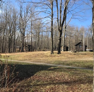 Cabins are located in four clusters of three each. None of the cabins have plumbing inside, however there are two centrally located bathhouses between clusters.