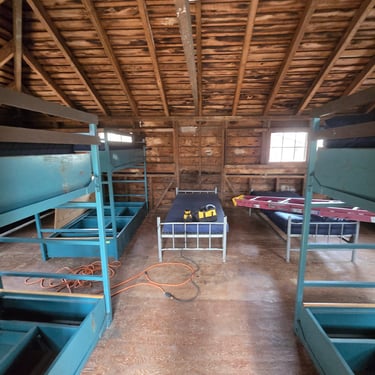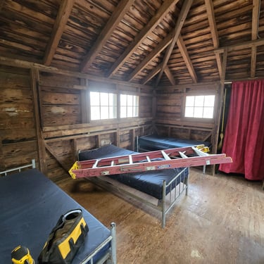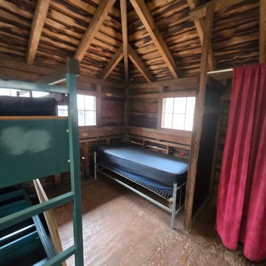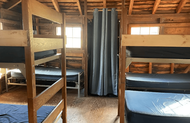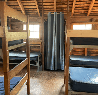 Bed and mattress. Each cabin has 12 twin-sized beds with mattresses. The number of each varies, but most appear to have three bunk beds and six twin beds. You could push two beds together for more room, as long as you move them back before you leave.